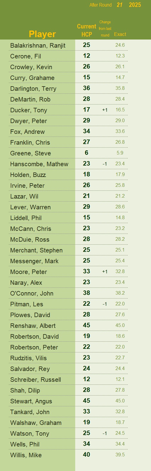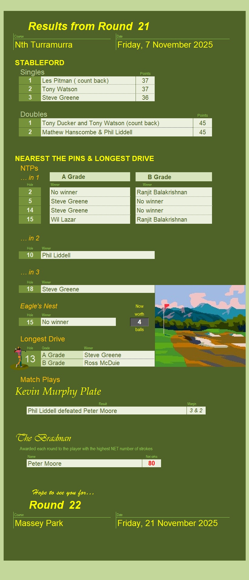 There was one match play decided, between Mr Handicapper and Phil Liddell. Chocolates went to Phil, 3&2. Well done, Phil and bad luck Pete (perhaps next year)! However, Mr Handicapper Moore, while picking up his sixth Bradman for the year, did sink a 20-foot birdie putt on the 7th to get a 5 pointer!