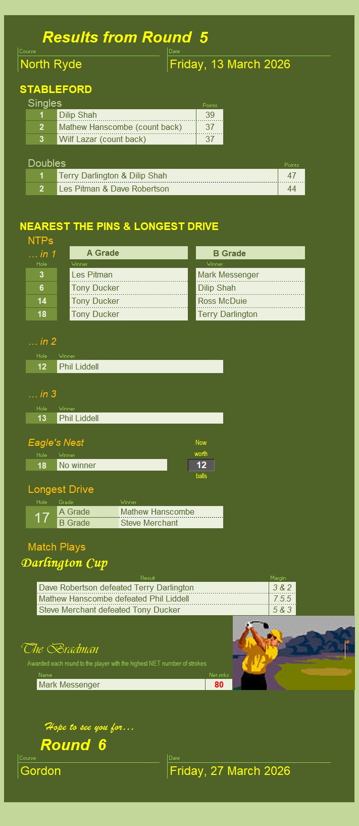 both the nearest in 2 and 3. The A grade Long Drive went to Mat with a